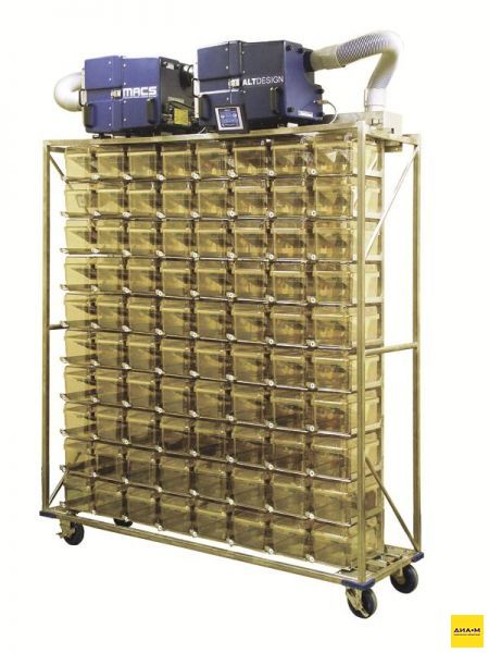 Стеллажи MACS состоят из рамы и набора модулей с вертикальными воздуховодами и держателями для стандартных клеток любых производителей в комплекте с крышками с вентиляционными клапанами (для мышей типа MAX75, Dura, для крыс и др.), а также для специализированных клеток Gentle-Air (позитивное давление) и Flex-Air (изоляция от внешней среды, позитивное или негативное давление).