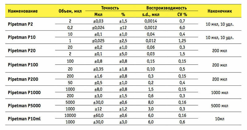 Автоматические пипетки серии Pipetman P, таблица